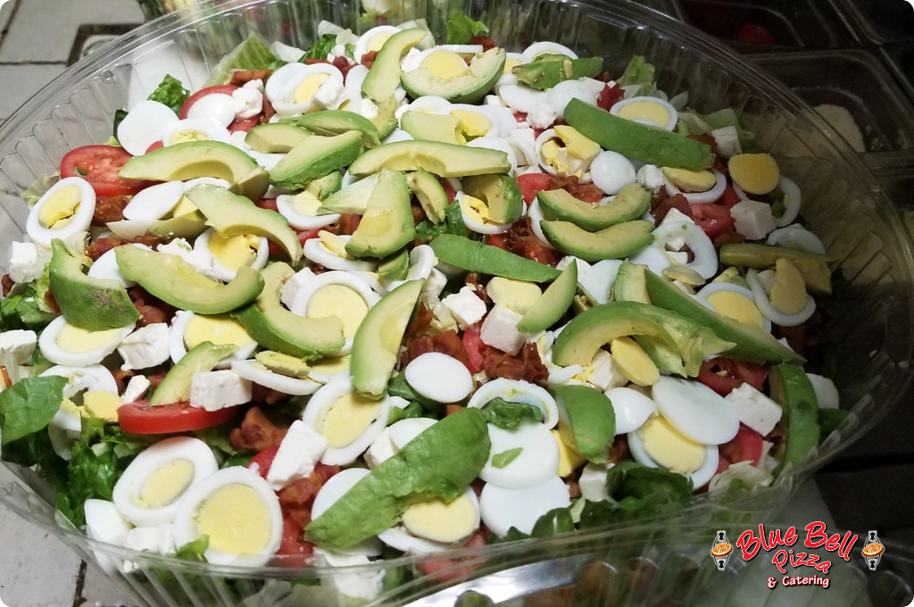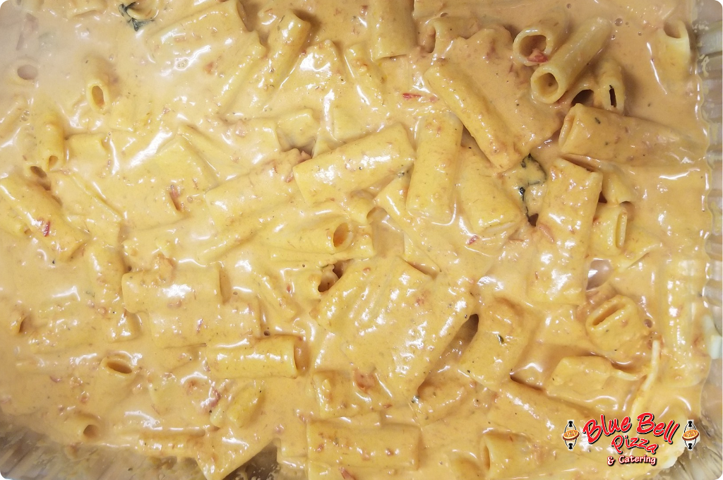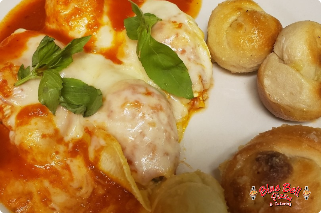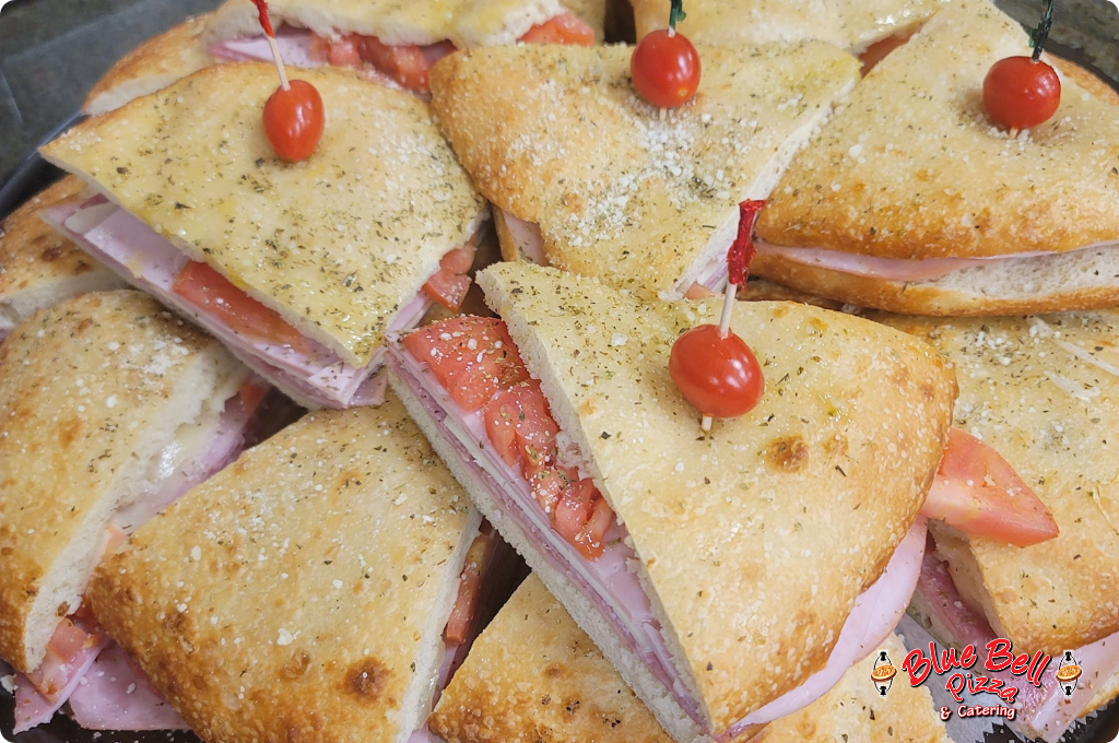 Get a taste of nostalgia with Blue Bell Pizza and Catering, Grandma Pizza A square thin crust loaded with roasted garlic, juicy plum tomatoes, fresh pesto, and melty mozzarella.